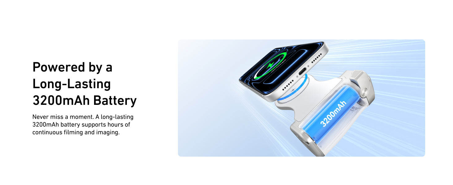 Inside the grip, a 3,200 mAh battery provides hours of continuous filming and imaging. It can wirelessly charge your iPhone while you shoot, helping offset the power draw from 4K video, AI filters and high brightness.