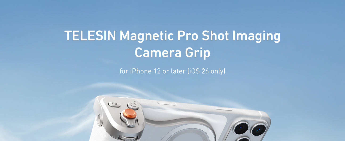 Magnetic Pro Shot Imaging Camera Grip is TELESIN’s 2026 flagship phone grip for iPhone creators. It’s a magnetic phone camera grip that snaps onto MagSafe iPhones (iPhone 12 or later, iOS 26 only) and turns your phone into a pro-feeling camera, with a comfortable grip, physical shutter controls, a precision dial and a long-lasting 3200mAh battery.