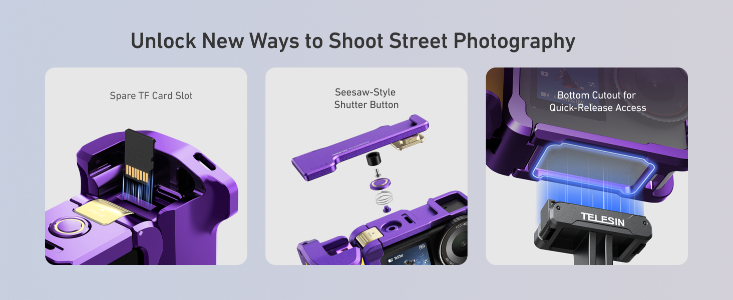 Street moments are often gone in seconds. TELESIN’s seesaw-style shutter puts recording control where your finger naturally rests on the grip: