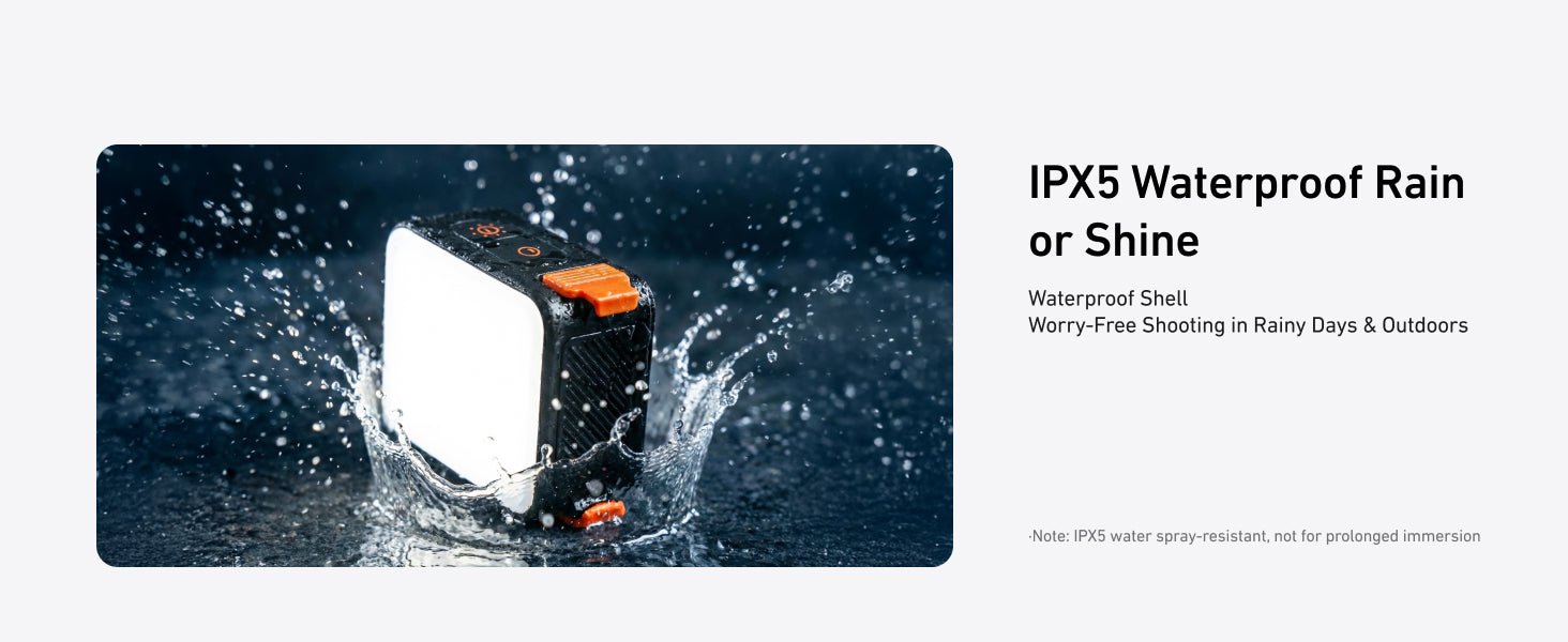 Waterproof: The IPX5 rating ensures this fill light is water-resistant, making it ideal for shooting in rain or wet conditions. Don’t worry about your shoot getting interrupted by weather.