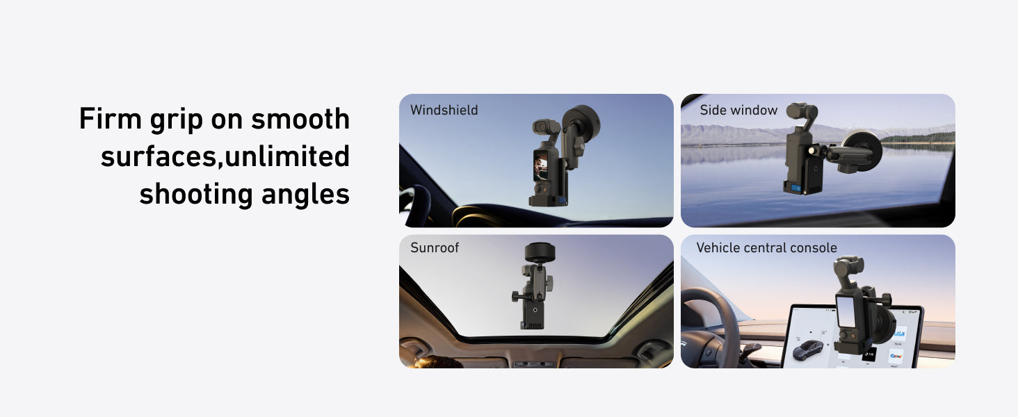 The suction cup ensures a secure hold on windshields, side windows, sunroofs, and any other smooth surface. It's designed to stay in place even during high-intensity shooting, providing stable footage without worrying about the mount detaching.