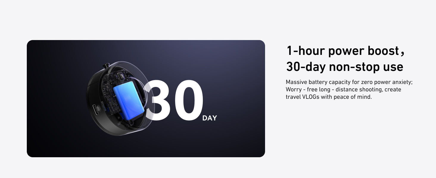 A: The battery lasts up to 30 days of continuous use with a single full charge, plus a 1-hour quick charge for a boost.