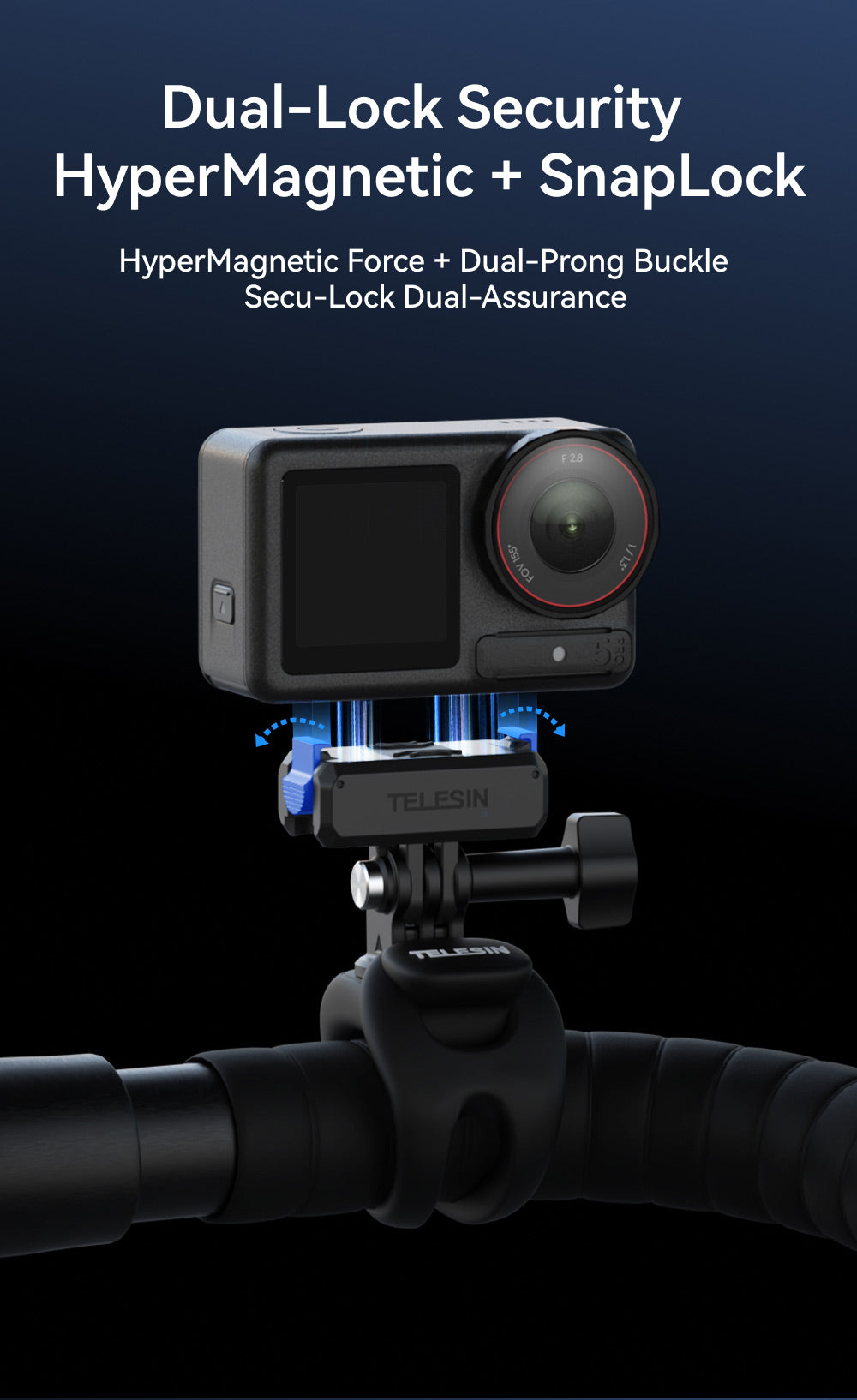 This mount combines HyperMagnetic™ holding force, a mechanical dual-prong buckle and a silicone shock-absorbing pad to keep your footage stable and your camera secure.