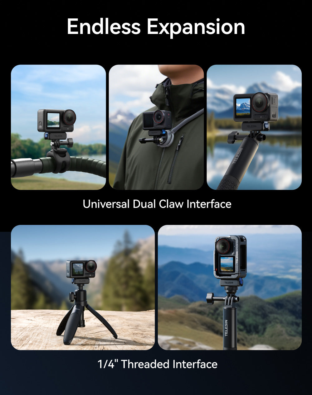 - Universal dual-claw interface – Works with Osmo Action 5/4/3 and other action cameras that use the common dual-prong system.