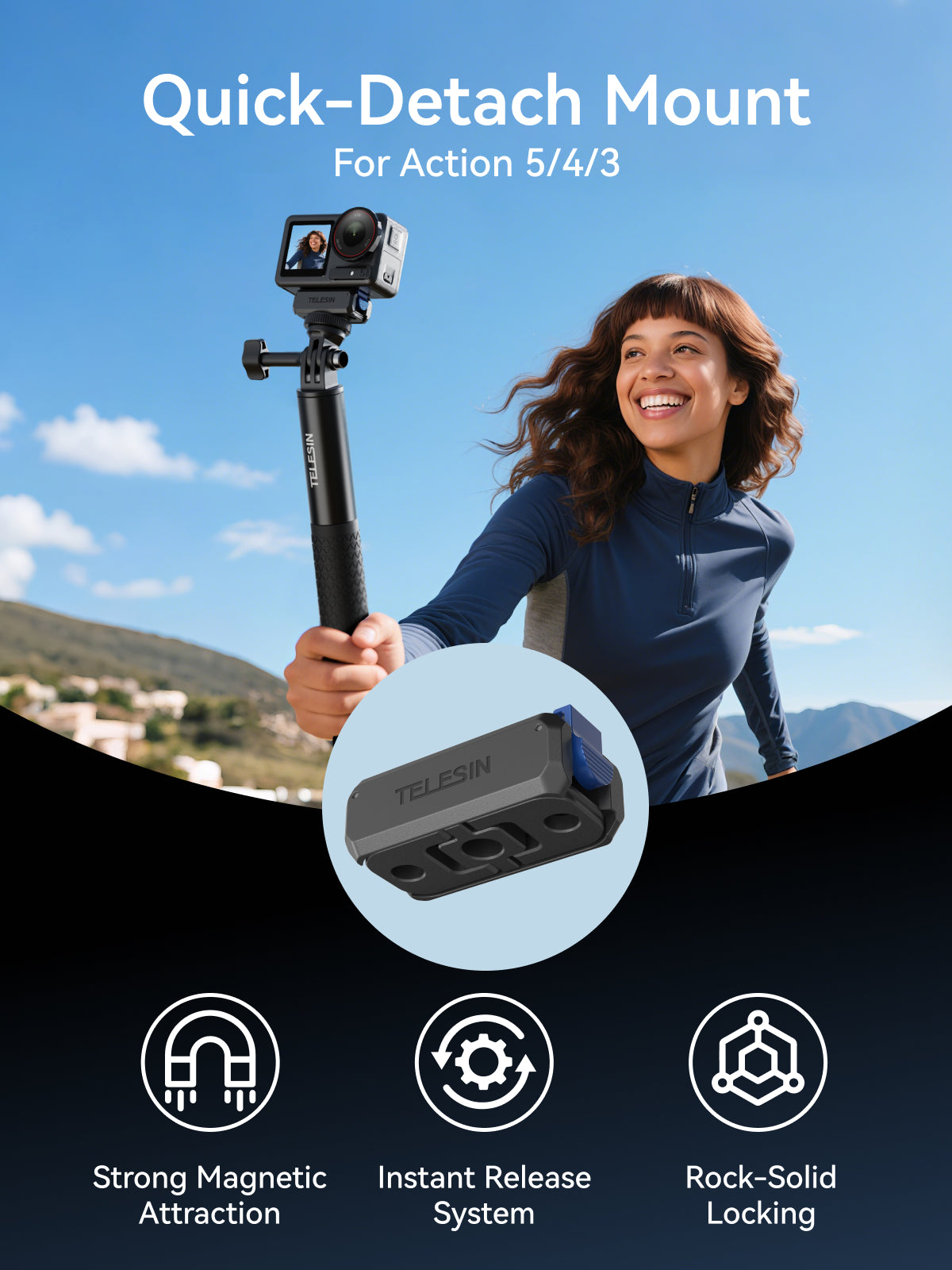 Snap your DJI Osmo Action 5/4/3 on and off tripods, helmets and rigs in seconds with a compact magnetic quick-release mount that’s built for real-world action.