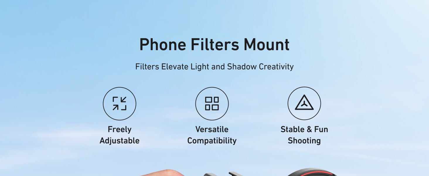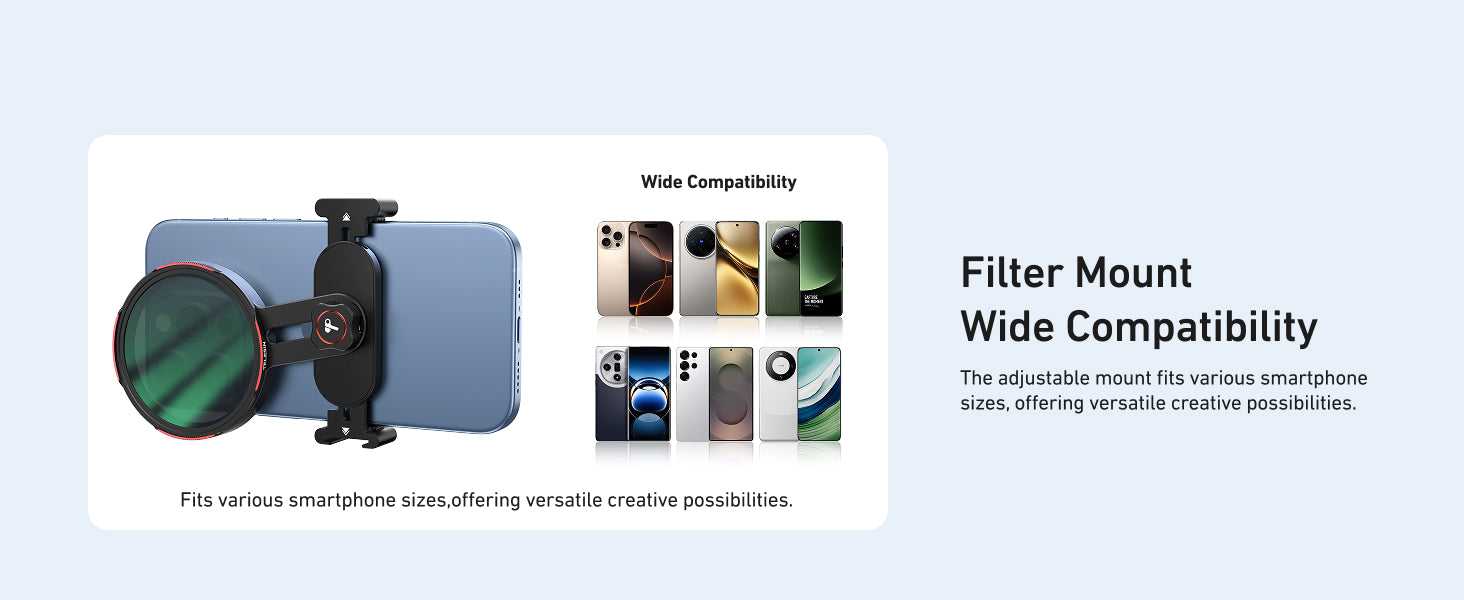 A8: The mount is compatible with various smartphone camera filters, including ND filters, polarizers, and color filters. These filters are perfect for enhancing your creativity and controlling light exposure when shooting videos or photos.