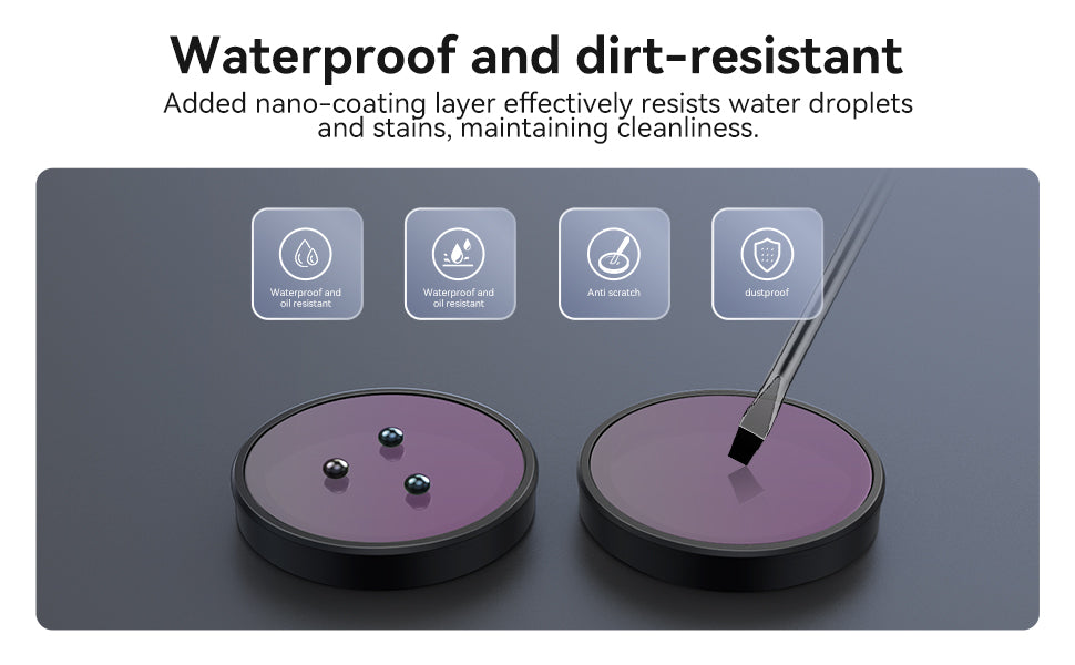 In dusty and dirty environments, the nano-coating and hard optical glass surface together provide dust and scratch resistance. Small particles are easier to blow or wipe off, and the filter is better able to withstand gentle cleaning and accidental contact compared to the bare camera lens.