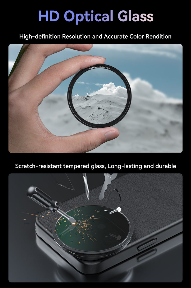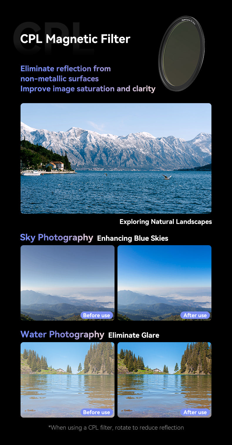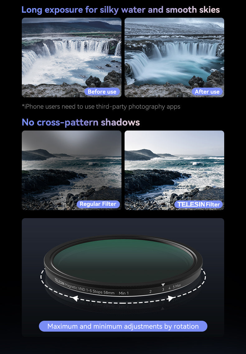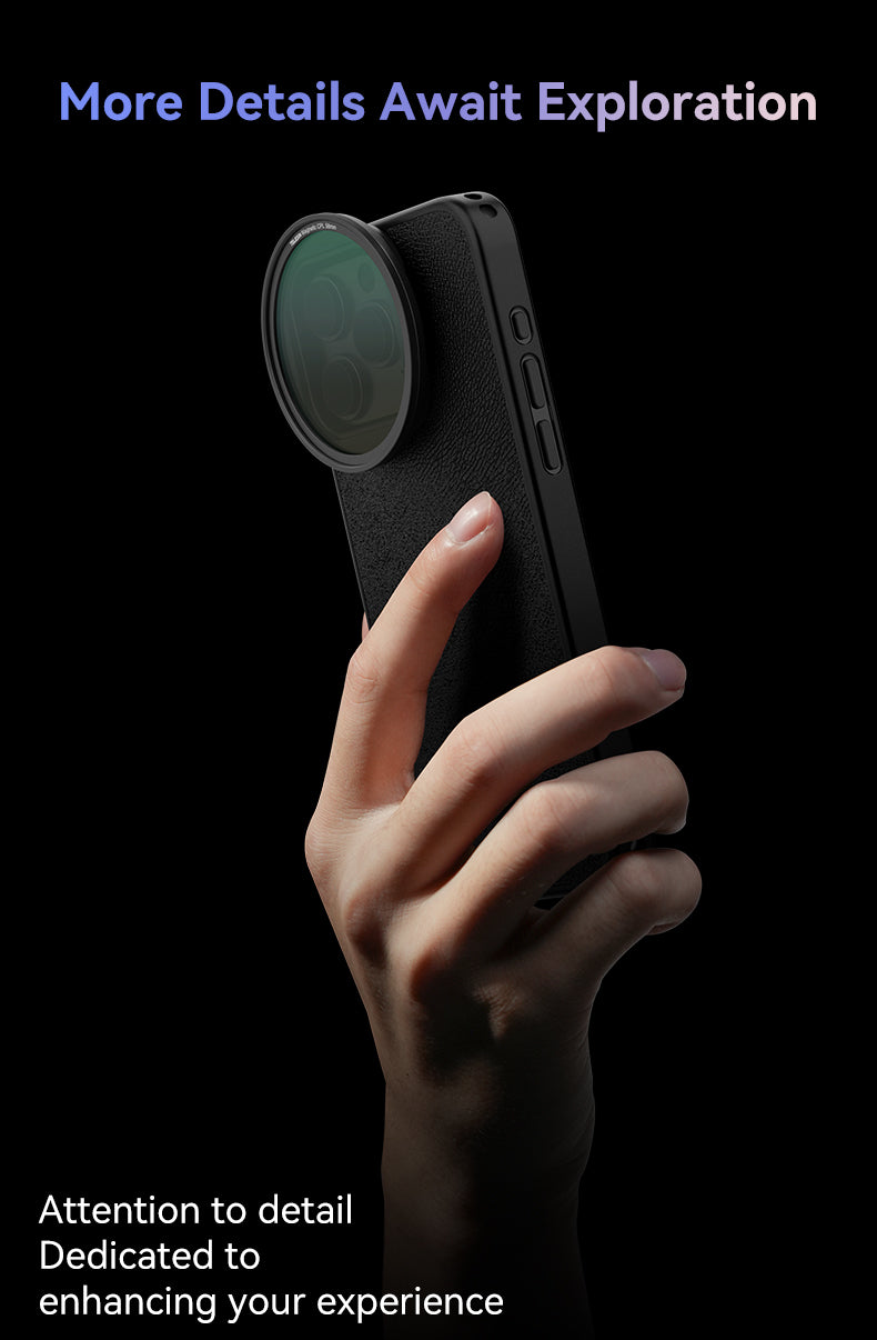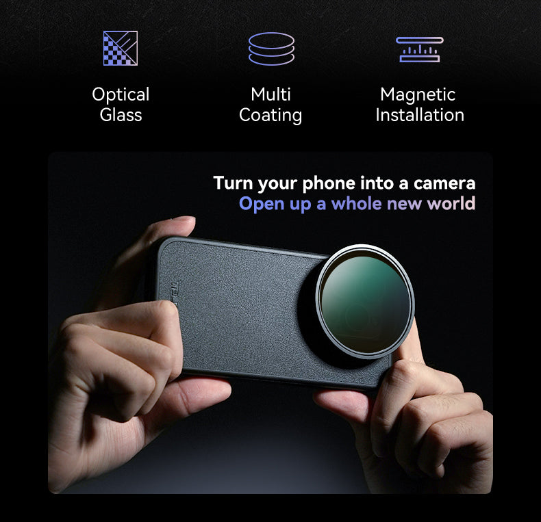 It unlocks new mobile photography techniques by allowing you to quickly attach CPL (Circular Polarizer) and optional VND (Variable ND) magnetic filters directly to your phone. In seconds, you can turn your phone into a camera and open up a whole new world of creative shooting, without carrying a bulky camera setup.
