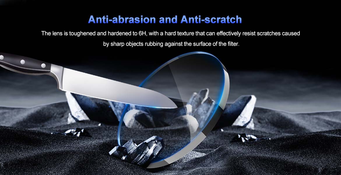 4. The lens is toughened and hardened to 6H, with a hard texture that can effectively resist scratches caused by sharp objects rubbing against the surface of the filter.